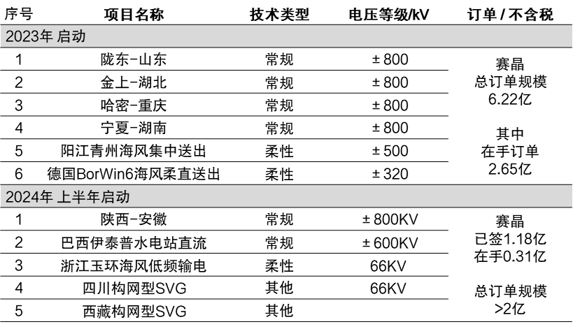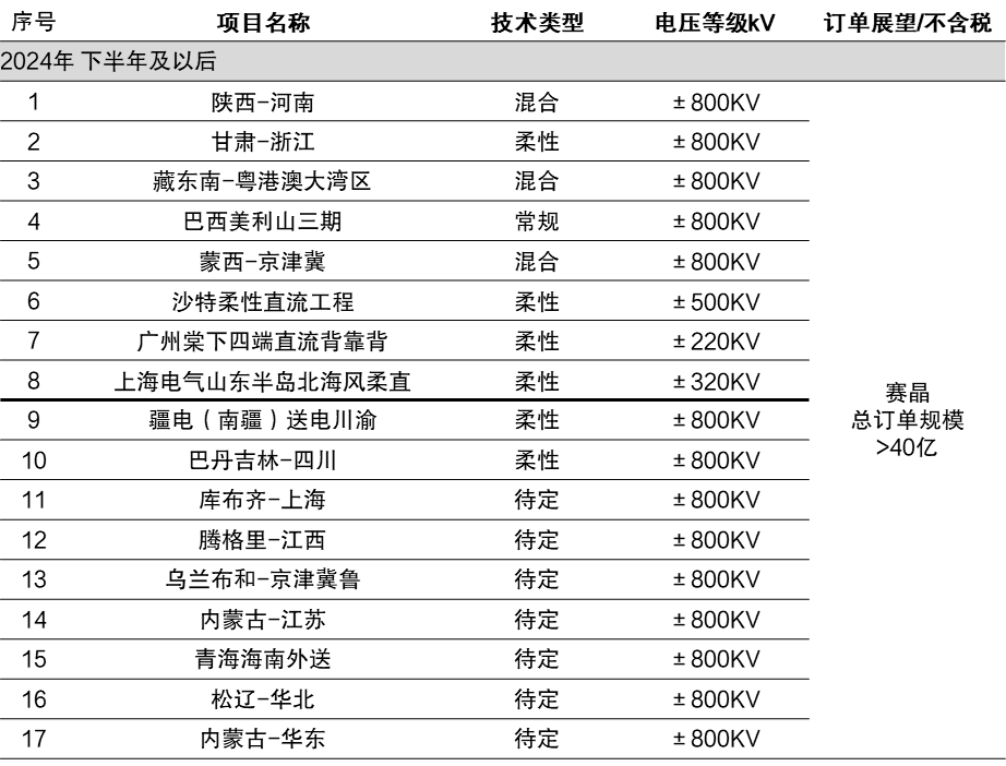 已公開的電網規劃中17個項目,本集團潛在訂單規模超40億元。除了“陜北-安徽”、“甘肅-浙江”、“蒙西-京津冀”等國內直流輸電工程,“沙特中南、中西”、“巴西美麗山三期”等中國企業中標的國外直流輸電工程以外,近期國家電網公布了“疆電(南疆)送電川渝”、“巴丹吉林-四川”等“五交九直”特高壓輸電工程新規劃。上述項目,以特高壓輸電為主,還包括海風直流送出、構網型低頻輸電等多種類型,總數高達17個,并有望為本集團帶來總計超過40億元的訂單。