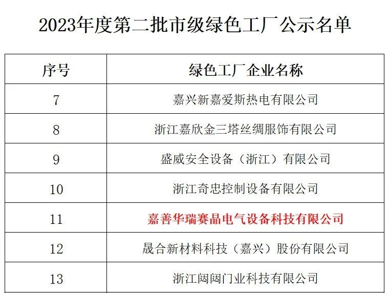 浙江省嘉興市經(jīng)濟(jì)和信息化局日前公布了《2023年度第二批市級綠色工廠》的公示名單,多多28成員企業(yè) 嘉善華瑞賽晶電氣設(shè)備科技有限公司榮譽(yù)上榜,獲評“綠色工廠”稱號。這是對賽晶堅(jiān)持踐行“以科技創(chuàng)新,推動綠色能源發(fā)展”的認(rèn)可與肯定,更是全方位彰顯了賽晶的“綠色智造實(shí)力”。