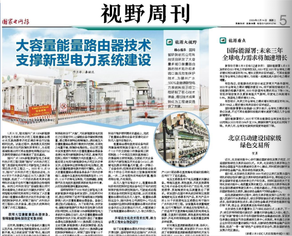 《國家電網報》刊登題為“大容量能量路由器技術,支撐新型電力系統建設”文章