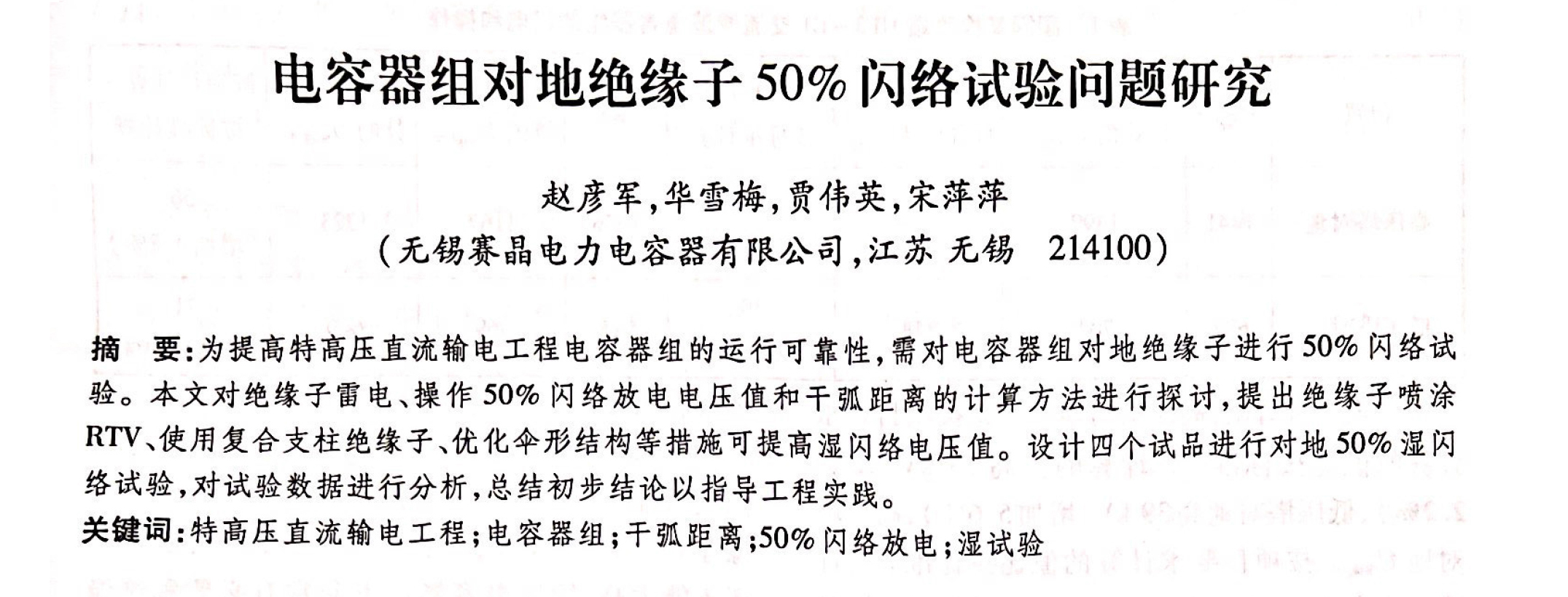 《電容器組對(duì)地絕緣子50%閃絡(luò)試驗(yàn)問(wèn)題研究》由無(wú)錫賽晶趙彥軍,華雪梅,賈偉英,宋萍萍撰寫(xiě),主要論述了結(jié)合工程項(xiàng)目的實(shí)際應(yīng)用,有針對(duì)性的進(jìn)行絕緣子U50試驗(yàn)驗(yàn)證及相關(guān)研究,為直流輸電電容器組的安全運(yùn)行奠定扎實(shí)基礎(chǔ)。