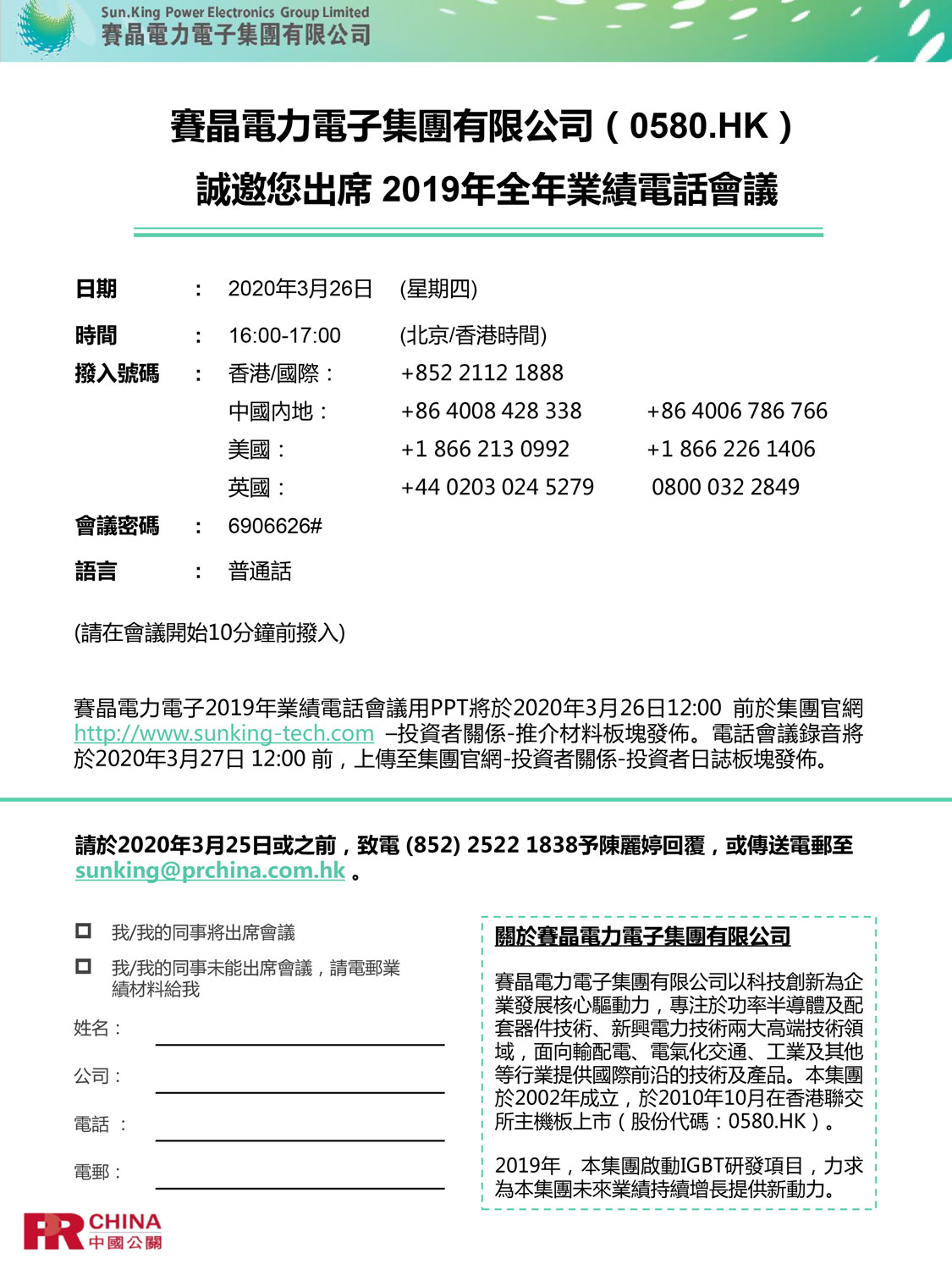 賽晶電力電子集團有限公司(0580.HK),將于2020年3月26日 16:00-17:00 召開2019全年業績電話會議。