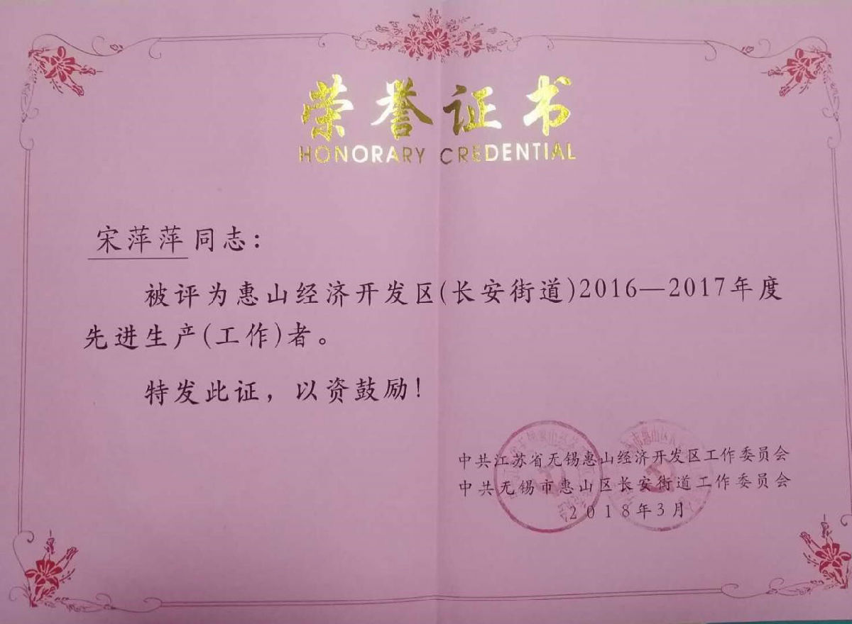 此外,本次會議上獲獎的還有:無錫賽晶電力電容器有限公司設(shè)備副經(jīng)理葛昌晶榮獲惠山經(jīng)濟(jì)開發(fā)區(qū)(長安街道)“2016-2017年度優(yōu)秀共產(chǎn)黨員”榮譽(yù)稱號,質(zhì)量部主管宋萍萍榮獲惠山經(jīng)濟(jì)開發(fā)區(qū)(長安街道)“2016-2017年度先進(jìn)生產(chǎn)工作者”榮譽(yù)稱號。