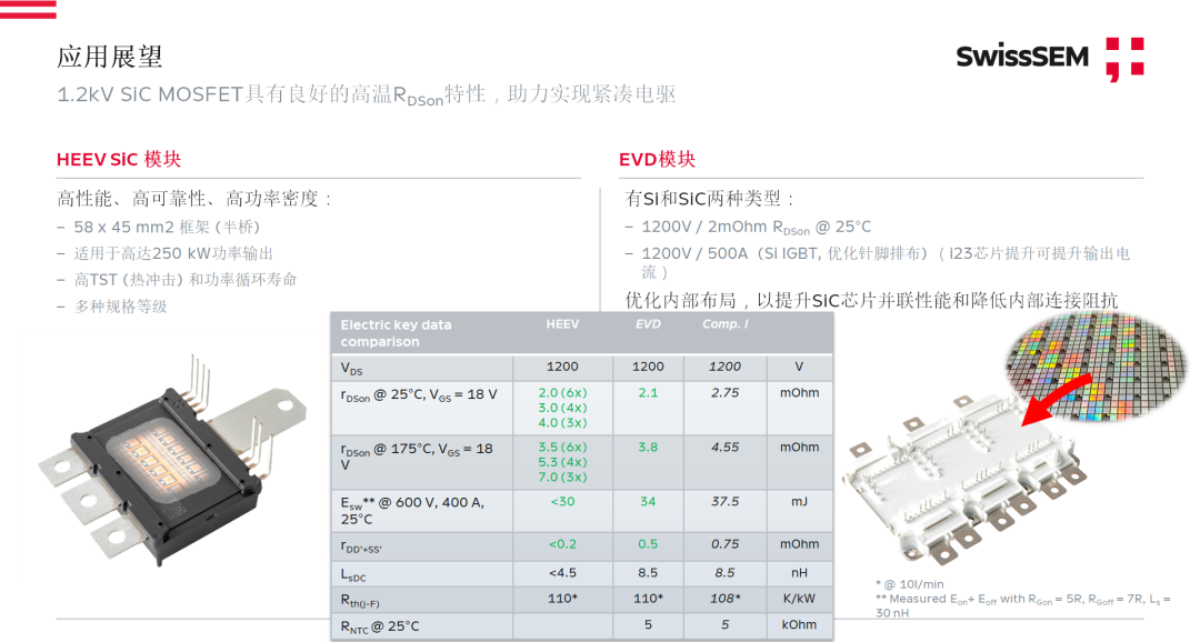 此外,采用此SiC MOSFET芯片,賽晶還推出了多規(guī)格、型號(hào)的車(chē)規(guī)級(jí)、高性能HEEV封裝、EVD封裝SiC模塊。