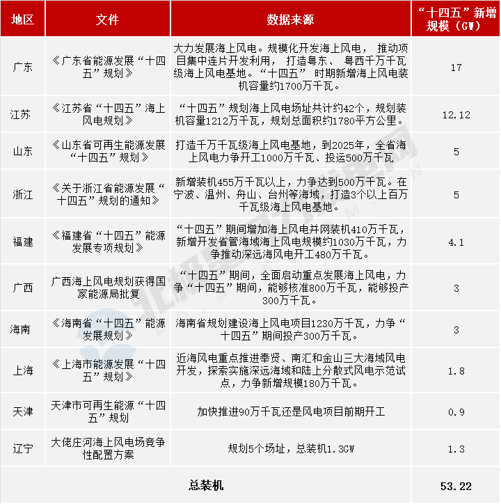 此規(guī)劃一出,沿海風(fēng)電開發(fā)迎來了新的市場機遇。據(jù)統(tǒng)計,沿海各省規(guī)劃的“十四五”海上風(fēng)電開發(fā)目標(biāo)超過5000萬千瓦,其中廣東、浙江、江蘇、山東省規(guī)劃體量較大,分別達到17GW、5GW、12.12GW、8GW。扣除2021年新增裝機的1448萬千瓦,還有超過3500萬千瓦新增空間。