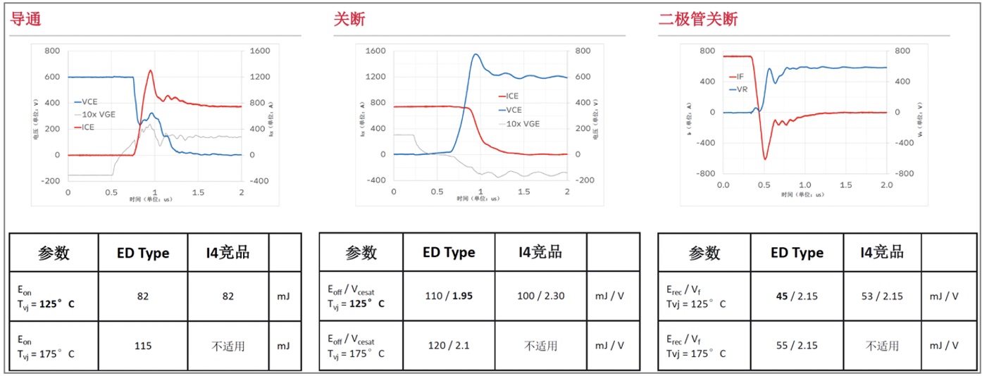 為了驗證i20和d20芯片組開關特性優越性,多多28在已經量產的1200V 750A ED系列模塊SISD0750ED120i20上與行業國際領軍企業同款IGBT4的同平臺模塊進行了對比測試,需要說明的是IGBT4模塊目前最高結溫只有150℃。通過對比發現兩個模塊開通損耗基本相當,關斷損耗采用i20芯片組的ED模塊略高,但飽和導通壓降的ED模塊更低;赿20芯片組ED模塊二極管與IGBT4具有相同的正向壓降,且能夠保持更低的反向恢復損耗,從測試來看采用i20和d20芯片組模塊要優于國際領軍企業的同類第4代IGBT模塊。
