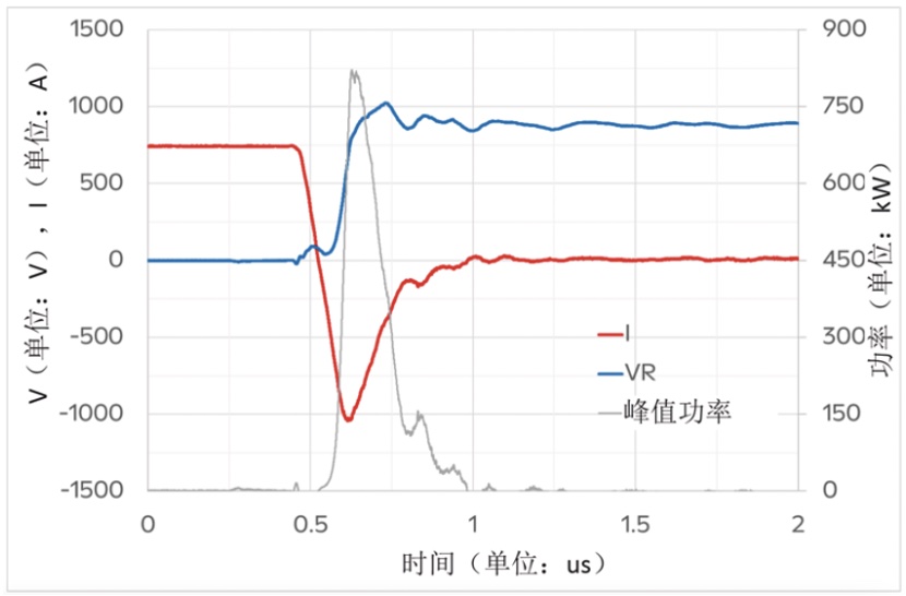 i20芯片組具有出色的短路穩健性,下圖圖4為ED模塊在175℃殼溫,800V母線電壓下測試得到的短路波形,短路電流只有額定電流的3倍左右,且短路波形無振蕩,模塊短路持續時間可達15us,為電路實時快速保護提供了保障。