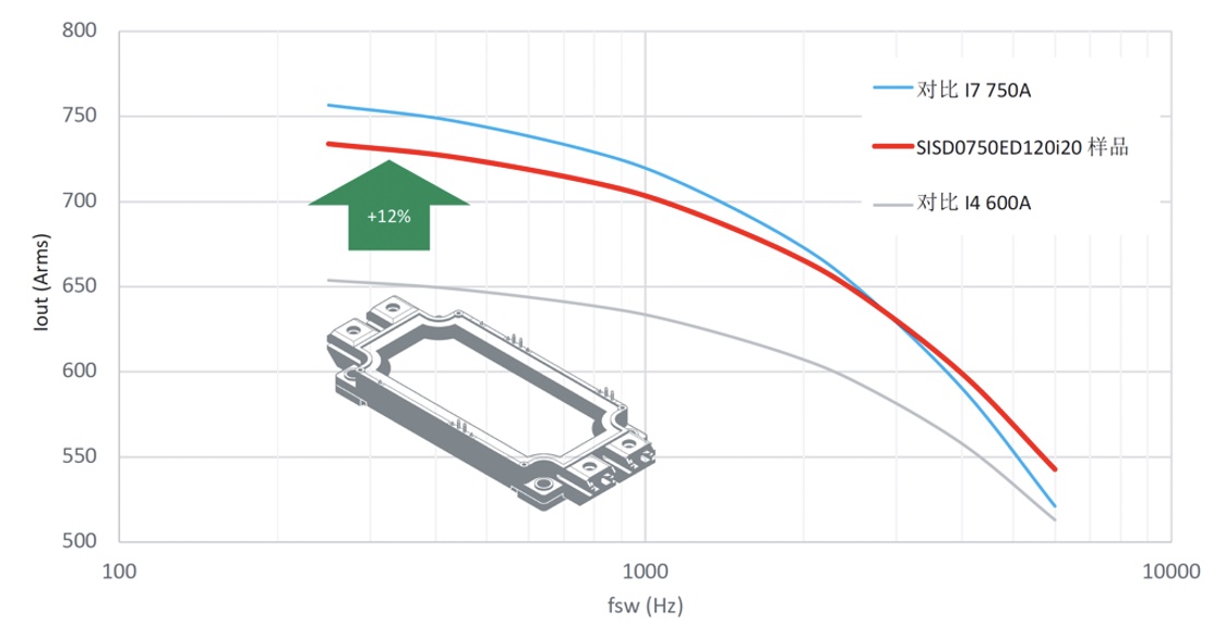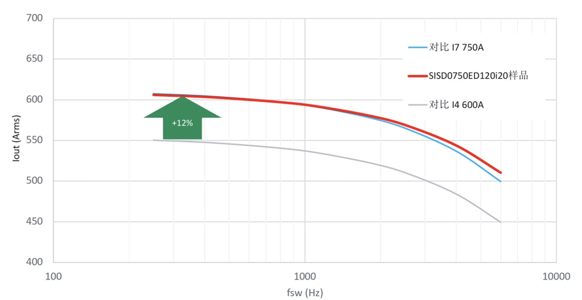 為了在系統應用層面驗證i20和d20芯片組的性能,將基于i20芯片組的ED型750A半橋模塊與競爭對手i4-600A和i7-750A兩款模塊分別在整流模式和逆變模式進行了對比仿真。性能曲線圖反映了逆變器輸出功率(或電流)與開關頻率的關系,仿真熱阻值取自數據表,而器件的靜態和動態損耗取自測量值。逆變工況下,ED-750A額定模塊在最壞的情況下比最先進的i7 740A模塊功耗低3%,當開關頻率直到3kHz時達到平衡。而與目前應用居多的i4-600A模塊相比,ED型模塊能夠提升超過10%的性能。在整流器模式下,多多28ED模塊的性能與最新的i7-750A模塊基本一致,相比i4-600A模塊相比,性能同樣可以提高10%以上。
