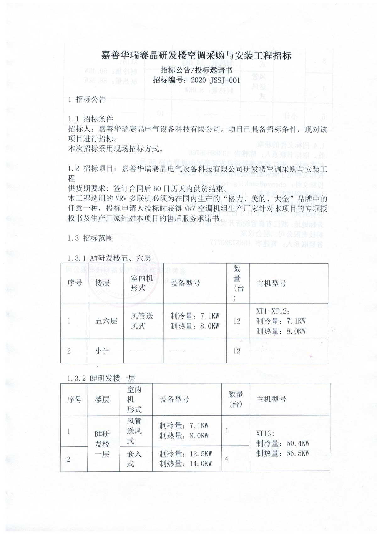 1.2 招標項目:嘉善華瑞賽晶電氣設備科技有限公司研發樓空調采購與安裝工程